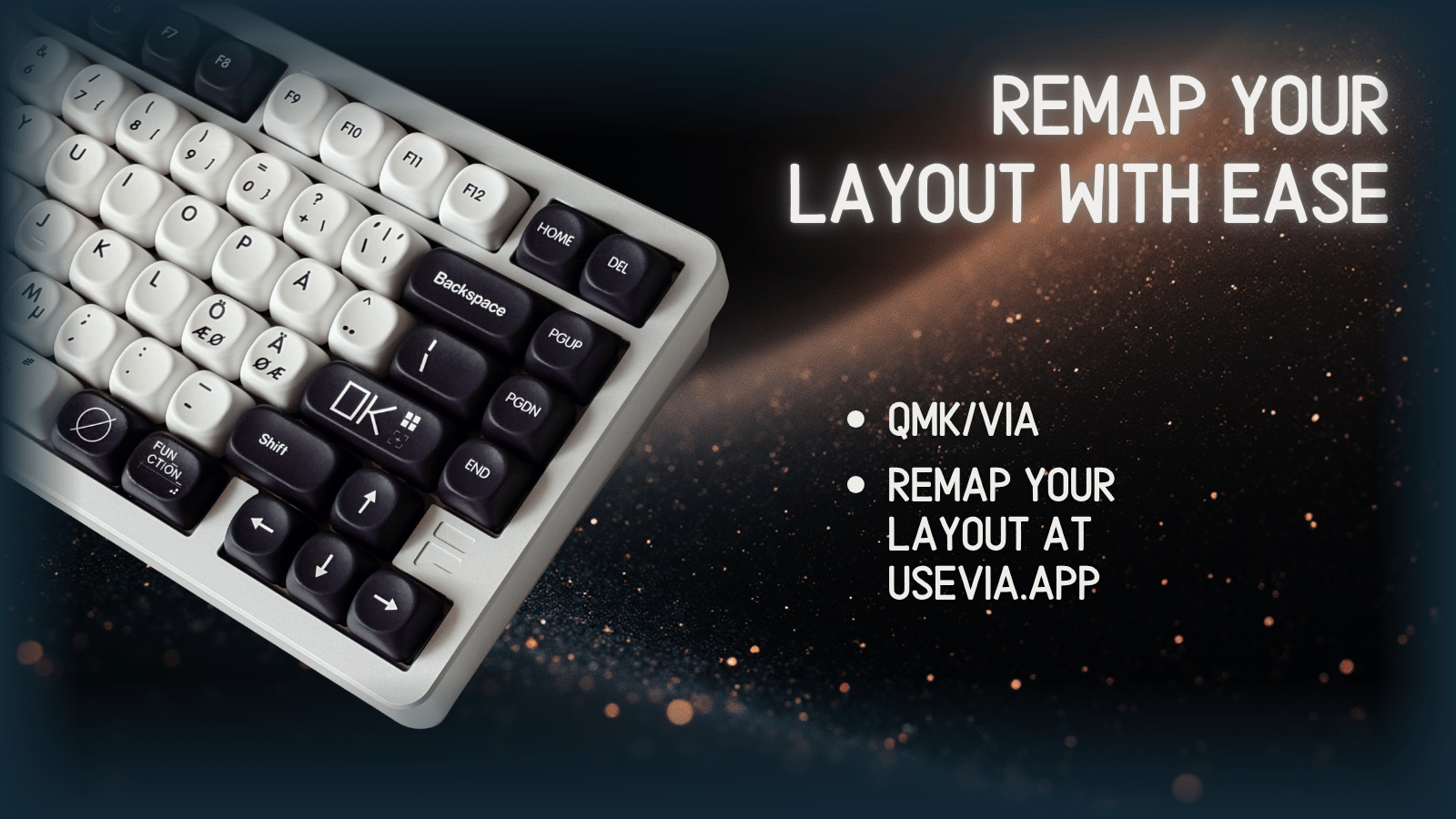 QMK/VIA — makes it easy to customize your layout, create FN combos, and custom macro commands. Changes to the layout are stored internally in the keyboard's memory, without the need for third-party software or flashing